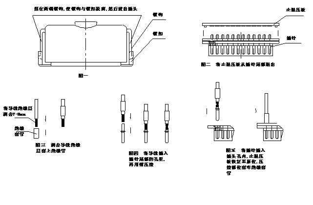 将插头座上的两块止退压板分别从插针尾部退出,拔出插针,把裴接导线的一端剥去8毫米左右的绝缘层,并套上绝缘套管,再将导线逐根插入插针尾部的孔里,用专用箝夹紧,然后将压接好的24根导线的插针插到插头上的插孔内,把两块止退压板恢复到原位,并把绝缘套管套牢在压接部位。